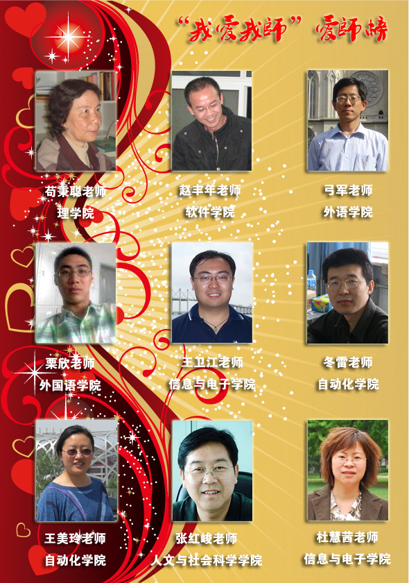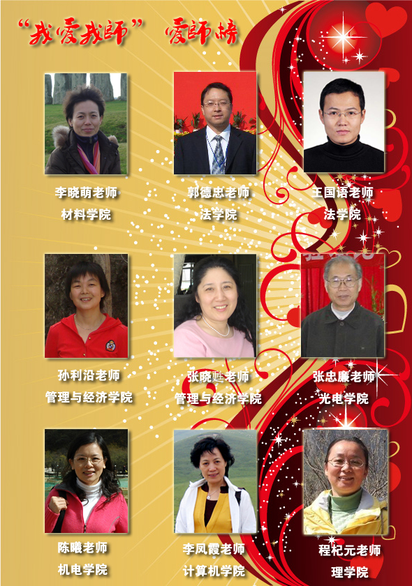 得天下英才而育之,是师者何等的光荣;有先生之风,山高水长,又是学生们何等的幸运!烛光长明,我爱我师,老师们的谆谆教诲和人格魅力长存我们心中,无论岁月怎样流逝,都带不走一份难以忘怀的桃李情。岁月有情,师爱无言。在同学们心中,亲爱的老师们不仅仅是勤恳的学者,也是无私的长者,他们用生命演绎传道授业解惑的真谛,用优秀的教学工作和对学生真诚的关怀赢得了同学的感激。