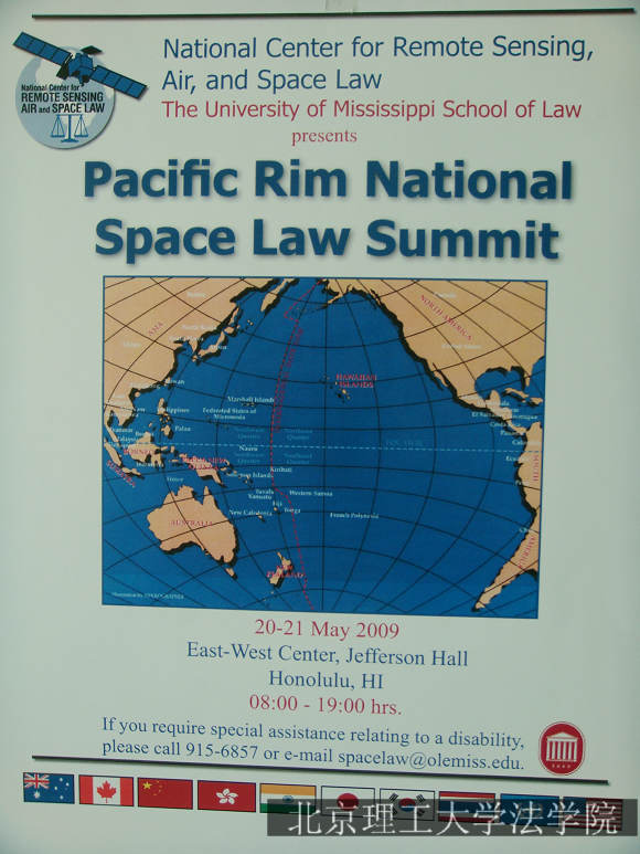 2009年5月19日至21日,“环太平洋地区国家空间法峰会”在太平洋上美丽的夏威夷大学东北中心召开,来自中国、美国、加拿大、澳大利亚、韩国、日本、印度、泰国、中国香港及联合国外空事务办公室的16位学者在会议上进行了专题报告,分别介绍各自国家或地区的空间立法现状及其与环太平洋国家空间法和空间活动的关系。