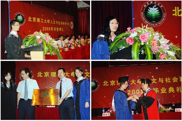 本科毕业生代表王飞成同学(左上)发言;研究生毕业生代表刘娜同学(右上)发言;毕业生代表向学院赠送礼物(左下),感谢学院培育之恩,表达毕业生共同的心愿:“人兴北理、文行天下”。最后,张红峻教授(右下)为参加典礼的每一位毕业生扶正流苏,代表学院向毕业生赠送纪念品。
