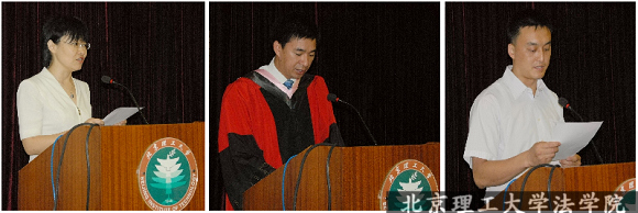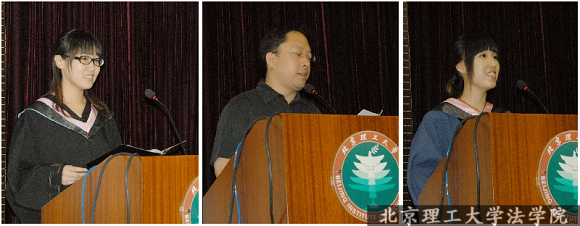 随后,最近被学校授予“我爱我师”荣誉称号的法学院教师郭德忠(中)代表教师向毕业同学寄语。法学院2005级本科优秀毕业生刘沫涵(左),2007级研究生优秀毕业生曾竞(右)作为学生代表发表毕业感言。