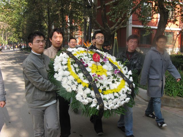 灵堂内摆满了社会各界敬献的花圈和花篮,简单布置的灵堂和洁白的菊花诠释着钱学森先生伟大而简朴的一生。同学们依次向灵堂正中的钱老遗像鞠躬致敬,钱老虽然离我们而去,但他崇高的精神与我们同在,他为中华民族做出的丰功伟绩永远牢记在我们心中。