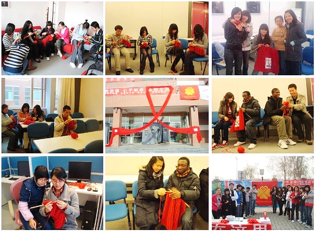 此次活动的另一大亮点是:全部依靠同学们的手工制作只制了一条长达30余米的毛线“红丝带”,此项活动开展与11月初,面向全校同学招收编织志愿者,共收到报名547人次,有二百余位志愿者亲自参加该工程,经过一个月的志愿者编织和社会工作专业全体师生的共同努力,终于完成了之一伟大的工程,这条“红丝带”于中午在北食堂二楼进行展出,必将在同学心中留下深厚的印象和影响。