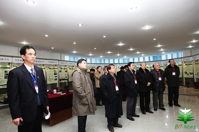 北理工科学技术研究院常务副院长陈杰为评估专家组成员介绍了学校近年来瞄准国家重大科技工程,开展科学研究及取得成果的情况。专家们在展板前驻足参观,并不时对学校重大科研项目中研究生参与情况等感兴趣的内容进行了询问。