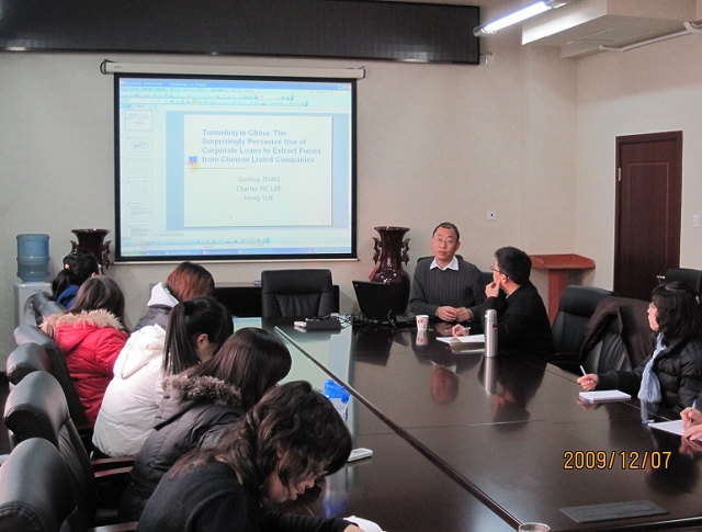作为管理与经济学院第四届研究生学术文化月活动的一部分,北京大学光华管理学院姜国华教授应邀于12月7日在中心教学楼,就自己感兴趣的两个主要研究领域(行为金融学与证券投资和中国投资者保护研究),结合他发表在国际A类期刊的二篇学术论文“Information Uncertainty and Expected Returns”和“Tunneling through Inter-corporate Loans: The China Experience”,就研究中如何选题、如何撰写并在国际高水平期刊发表论文作了一场精彩的学术报告,管理与经济学院会计系老师,部分博士生及会计硕士研究生参加了研讨会。