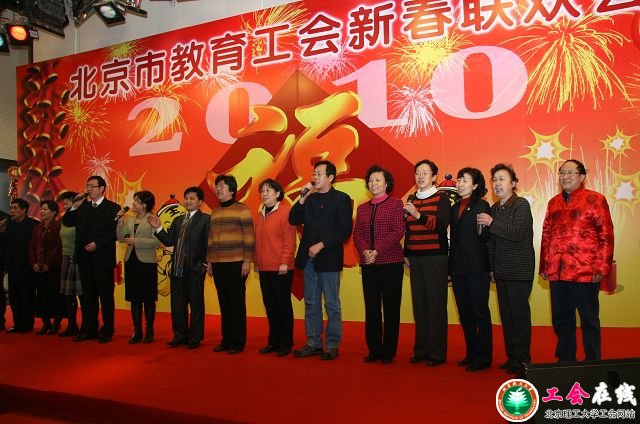 金牛乘风辞旧岁,玉虎踏雪迎新春。1月7日,北京市教育工会2010年新春联欢会在清华大学美术学院多功能厅隆重举行,联欢会现场张灯结彩、欢乐温馨,北京市教育工会系统工会干部欢聚一堂,共庆新年。北京市教育工会主席张青山,北京市教工委、部分北京高校工会的相关领导出席了联欢会;我校党委副书记、工会主席侯光明,校工会常务副主席张剑军及校工会专职工会干部参加了联欢会。