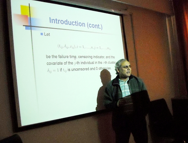 N. Balakrishnan教授首先对脆弱模型(Frailty model)进行了简单的介绍,脆弱模型主要应用于生存分析领域,用于处理那些不能观察到的协变量。较为流行的脆弱模型大多是基于伽玛(gamma)、威布尔(weibull)和对数常态分布的。在此次报告中教授介绍了一个广义的伽玛脆弱模型,作为特殊形式伽玛、威布尔和对数常态分布均包含在此模型之内。随后教授介绍了该广义伽玛脆弱模型的推导过程,以及模型参数估计,最后Balakrishnan教授给出两个实例以证明模型的正确性以及广泛的应用价值。