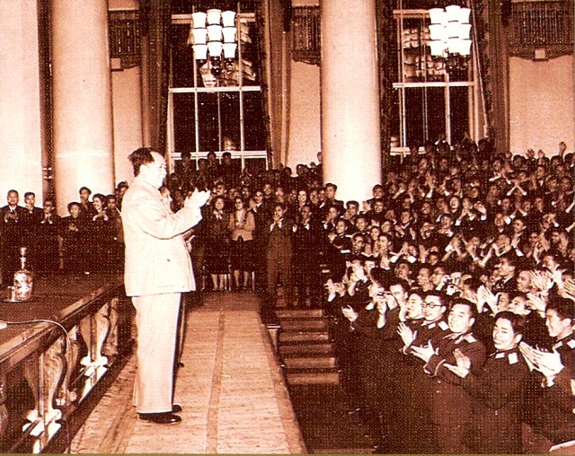 直到下午六点钟,在刘晓大使的陪同下毛主席到了莫斯科大学。当毛主席出现在莫斯科大学大礼堂的讲台时,我们都站起来欢呼,鼓掌“毛主席,您好”“毛主席万岁!”等口号。这时,有的同学高。这时,有的同学高喊“毛主席,我们看不清楚您。”因此,为了让全礼堂同学都能看清楚,毛主席走到讲台的前沿,并从左边走到右边,向我们招手致意。这时,我随大家一起振臂高呼,向毛主席致敬。礼堂内暴风雨般的掌声此起彼伏。毛主席身穿灰色中山装,身材魁梧,红光满面。他走到哪里哪里的人群就像涨潮的海水,向前涌动。所有的人都想扑到前排,以至于离领袖近点,再近点……因此,我也从座位上站起来到了过道上较近的地方。
