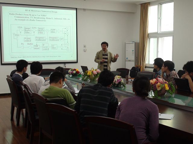 讲座主要内容是《CMOS RF Transceivers design》,刘大可教授循序渐进地讲述了射频电路接收器设计的理论和发展,并对周边理论和领域进行了深层次的介绍,同时为我院将来在相关学科建设方向、团队建设等方面提出了自己的一些建议,并针对目前行业的发展和研究领域的前景进行了深刻的分析。未来的4天内,刘大可教授将在本次信息与电子学院博士生论坛中为信息学院的师生们带来更多更精彩的学术报告,届时将针对信息与电子学院所属的相关学科的发展与信息学院师生进行深刻的技术交流。