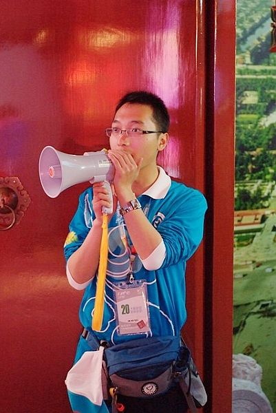 宇帆同学在世博园北京馆入口引导参观群众
