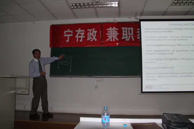 受聘仪式由魏名山主持。邹炳锁介绍了宁存政教授的学术经历:宁存政教授分别于1982年、1985年获中国西北大学物理系学士学位和理学硕士学位,于1991获德国斯图加特大学理学博士学位。1994-1995年,在亚利桑那大学做博士后,并于1996-1997年成为亚利桑那大学研究助理教授。1997-2006年是美国国家航天航空总署AMES研究中心资深科学家,其中2000-2004年担任计算纳米科学小组负责人及项目经理,2004-2007年担任纳米技术项目负责人。2006年至今,亚利桑那州立大学电子学教授。主要从事半导体纳米材料、纳米等离子体学等方面的研究工作。研究兴趣包括半导体纳米线的生长,表征,物理及其光电子方面的应用(包括激光,探测器,发光二极管,及太阳能光伏等器件);纳米等离子体学及纳米半导体光子学;半导体光电子物理,器件物理,微观理论及多体相互作用,半导体纳米结构的电学及光学性质。发表上百篇高水平论文,并多次主持国际会议。