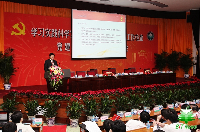 校党委书记郭大成致欢迎词,代表学校向各位专家不辞辛苦莅临学校检查指导工作表示热烈的欢迎,向工业和信息化部、北京市委教育工委各位领导长期以来对学校的关心支持表示诚挚的感谢。郭大成指出,在部属高校实施“一提三优”工程,是工业和信息化部进一步加强部属高校党建工作、本科教学、研究生教育工作,全面提升办学水平,实现科学发展的重要举措。近年来,学校紧紧抓住“一提三优”工程建设这一主线,对照评估找差距、立足评估谋发展、通过评估促建设、围绕评估创一流,有力地促进了学校各项事业的科学发展。学校将抓住这次迎接检查评估的重要机会,以评促建、评建结合,在改革中完善,在创新中发展,进一步推动党建工作的科学化、制度化和规范化,努力开创高水平研究型大学党的建设新局面。学校将全力配合好专家组的工作,如实汇报情况,虚心听取意见和建议,针对不足制定整改措施,努力使学校各项工作再上一个新的台阶!