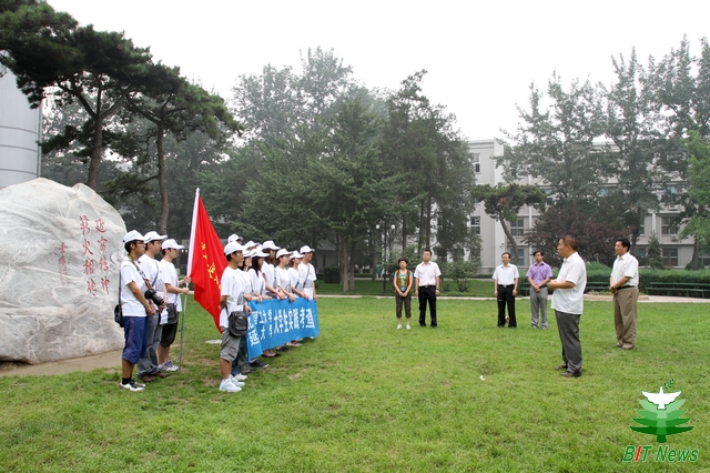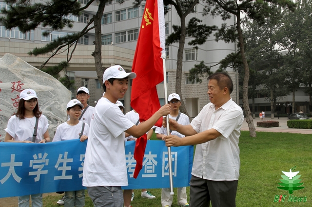最后,李和章副校长向孙啸宇队长授“北理工--延大社会实践”队旗。随后,校领导与队员们合影留念。同学明确了自己“寻先烈足迹,点信念火炬,树理想丰碑”的使命,对即将开始的延安之行充满期待。