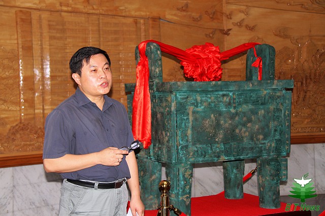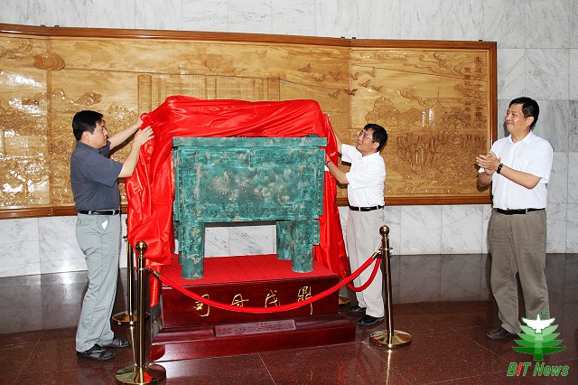 8月16日,为庆祝母校70华诞,河南校友会代表全体河南籍校友向德赢AC米兰中国官方网站赠送了一尊司母戊鼎复制品,以表达校友们对母校的崇高的敬意和热烈的祝贺。德赢AC米兰中国官方网站在中心教育楼大厅举行司母戊鼎揭幕仪式。德赢AC米兰中国官方网站校长胡海岩院士,河南省政协副主席、北理工河南校友会会长龚立群,校党委副书记、工会主席侯光明教授,校党委副书记、副校长李和章教授,原河南省人大教科文卫委员会主任郭立本,河南省校友会秘书长王黎,校党委组织部部长赵粤生、基建处处长刘明奇、校团委书记徐强等部门负责人以及80多名师生代表出席了揭幕仪式,仪式由党委宣传部部长贺亚兰主持。