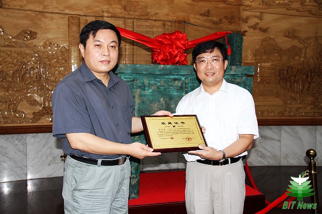 龚立群还向胡海岩校长赠送了司母戊鼎的收藏证书。