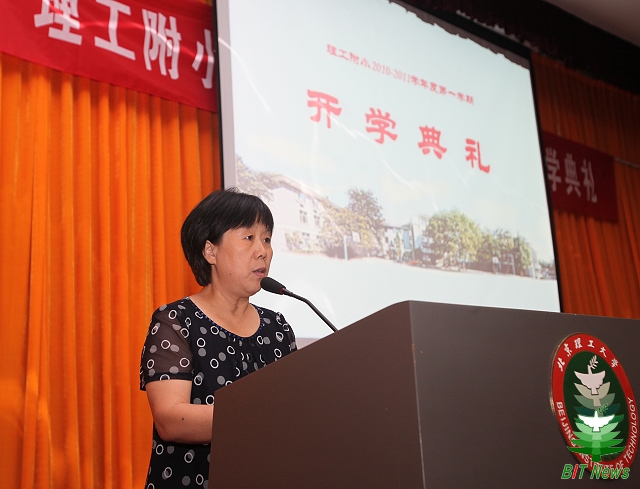 大会在庄严的国歌声中拉开帷幕。首先,附小的柏淑芳校长回顾了上个学期的全校工作,对新学期工作作了部署。新学期,为了确保附小学生能按时开学,大学领导为孩子们安排了崭新的研究生教学楼作为临时的学习场所。柏校长代表全校500名师生向关心附小工作的大学领导、为附小提供教室的研究生院领导、负责安全保卫工作、和战斗在一线的施工队的工作人员表达了衷心的感谢!