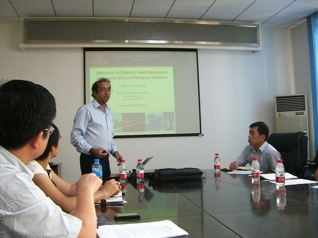 来访期间Krishnaswamy教授还与院、系领导进行了广泛研讨交流,徐春广教授介绍了先进加工技术重点学科实验室在超声无损检测领域的研究成果,双方就相关学术合作问题进行了深入探讨。