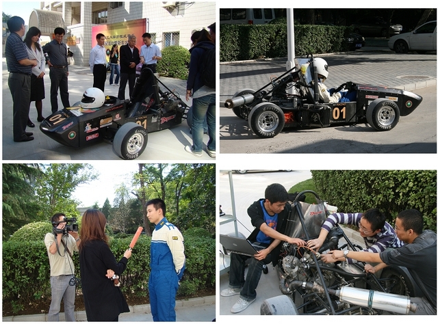 汇报阶段结束后,在大家的期待下,李和章、仲顺安两位老师共同揭开了我校学生自行研发的第一辆方程式赛车的神秘面纱,李和章老师为赛车手董路宁佩戴头盔并启动赛车引擎,在广大师生和媒体的关注下这辆凝聚着众多学生心血的赛车现场进行了试跑并进行了提速、制动和漂移表演。
