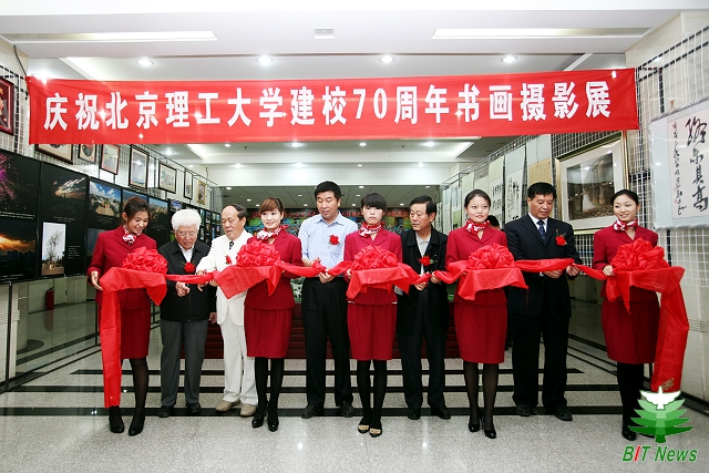 9月24日下午,在迎接70周年校庆之际,为进一步展现校园文化建设成果,营造浓郁和谐的校园文化氛围,我校庆祝北理工建校70周年书画摄影展开幕式在校体育馆举行。中国军工文化协会常务副会长苏青云,著名书法家、首都师范大学教授、校书画摄影协会顾问张同印,民间烙画艺术家郭增辉先生以及我校党委书记、校书画摄影协会名誉会长郭大成,校党委副书记、工会主席、校书画摄影协会会长侯光明,副校长赵平、赵显利,中国工程院院士、校书画摄影协会顾问周立伟,党委宣传部部长、学校文化建设办公室主任贺亚兰,校团委书记徐强等出席了仪式。仪式由校工会常务副主席、校书画摄影协会秘书长张剑军主持。参加仪式的还有各职能部门负责人、各学院领导和师生代表。