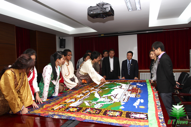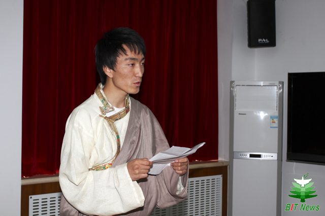 07级学生曲旦益西代表北理在藏藏族校友和在读的藏族同学祝母校生日快乐,祝母校的老师和同学们身体健康、扎西德勒!他在发言中说,为了表达对母校多年栽培的感激之情,北理西藏校友会从今年7月份就开始准备礼物,已毕业的22位藏族校友一起凑了3万多元,请西藏本土手工唐卡制作家历时两个多月精心制作而成。之所以选送绘着布达拉宫的唐卡,是因为布达拉宫是西藏人民心中的圣地和福地,而对于北理的藏族学子来说,母校也是圣地和福地。我校从2003年开始招收藏族学生,目前已有四届毕业生,分别在西藏政府、银行、工商、司法、质监等部门工作。在校藏族学生现有23人。