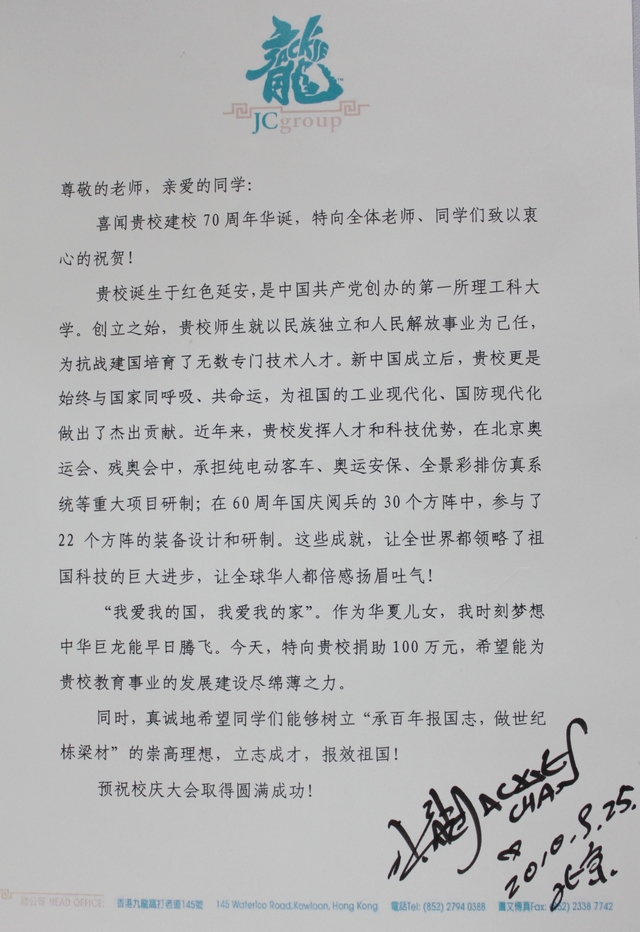 在德赢AC米兰中国官方网站迎来70周年华诞之际,成龙先生向学校慷慨捐赠100万元人民币,并发来贺信预祝校庆活动圆满成功!