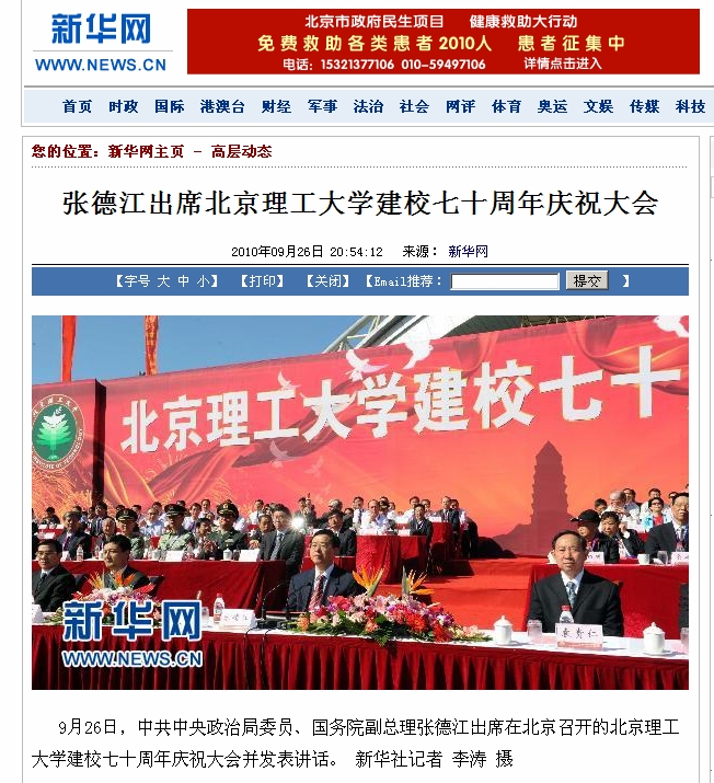 北理工70周年校庆系列活动受到了各大网络媒体的广泛关注,新浪网在我校校友新浪网执行副总裁、总编辑陈彤的亲自关怀下,专门开通了北理工70年校庆专题网站(点击可进入),在9月25日、9月26日以图文形式全程直播了徐特立教育思想研讨会和校庆庆祝大会。
