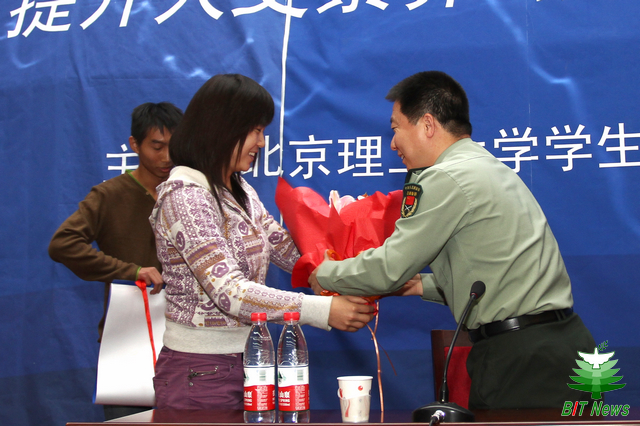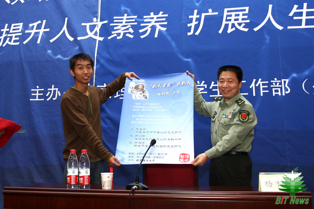 随后,杨利伟少将与在场师生进行互动交流。对于同学们对航天事业表现出的兴趣和热情,杨利伟少将给予了赞扬和鼓励,并耐心解答了有关我国载人航天发展规划、载荷专家选拨等方面的问题,他真心希望北理工的同学们走入载人航天队伍,通过努力飞得更高、更远。讲座结束后,学生代表将本次讲座的海报和鲜花献给杨利伟少将,再次表达我校师生的感谢和敬意。