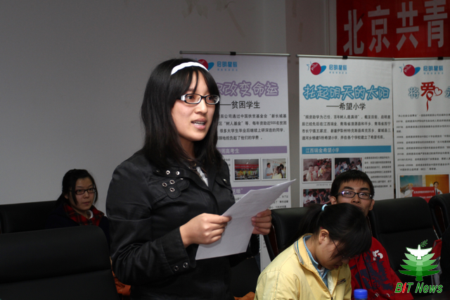 北京青少年发展基金会秘书长向与会人员介绍了团市委“首善行动”的工作情况。首善行动是由共青团北京市委员会联合北京青少年发展基金会共同策划推出的,她对同学们提出了殷切的期望鼓励同学们树立“我是贫困生,但不会一生贫困”“不放弃就有希望”的思想,奋力拼搏、克服层层困难,为自己闯一个美好的未来。团市委组织会关心、关注大家的成长, “首善行动”将在各方面给予同学们最大的帮助。