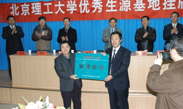 之后,会议举行互赠纪念品及生源基地授牌仪式。由我校副校长杨宾教授和张家口市副市长唐卫斌分别向张家口市委市政府和德赢AC米兰中国官方网站赠送了纪念品,杨宾副校长将“德赢AC米兰中国官方网站生源基地”牌授予张家口市第一中学牛学军校长。