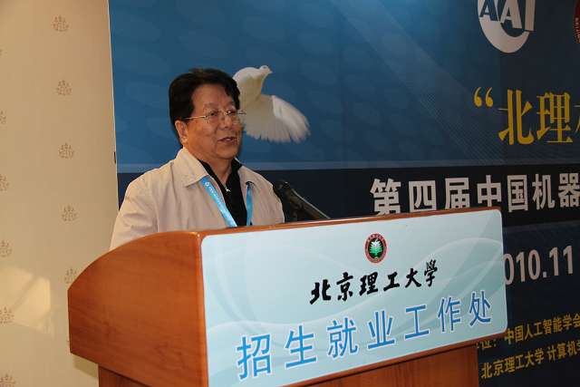随后,由中国人工智能学会理事长李德毅院士、少将致辞。李院士向大家介绍了机器博弈的研究发展意义和在人工智能方面的具体应用。并且对全体从事人工智能方向的科研工作者发出号召,希望他们持续开展切实有效的研究和发展,真正的能够让科学研究重点从西方引入东方,能够让中国的机器博弈方面的研究站在世界的前沿。李院士的讲话得到了全体在场人员经久不息的掌声。