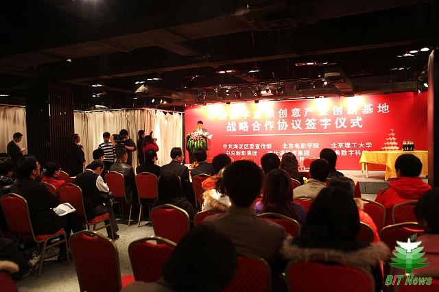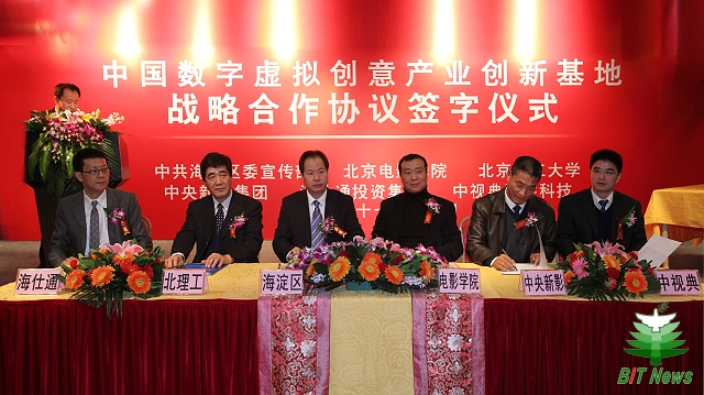 11月18日上午,中国数字虚拟创意产业创新基地战略合作协议签字仪式在中央新影集团发布厅隆重举行。中共北京市海淀区委常委、宣传部部长李彦来,德赢AC米兰中国官方网站副校长赵显利,中央新影集团副总裁刘成浩,北京电影学院党委副书记、副院长孙立军,海仕通投资集团总经理张国俊,中视典数字科技有限公司总经理王正盛代表六家基地成立发起单位出席了签字仪式。北理工党委宣传部部长贺亚兰、艺术教育中心主任王立群作为嘉宾代表出席仪式。仪式由海淀区委宣传部常务副部长魏怀中主持。