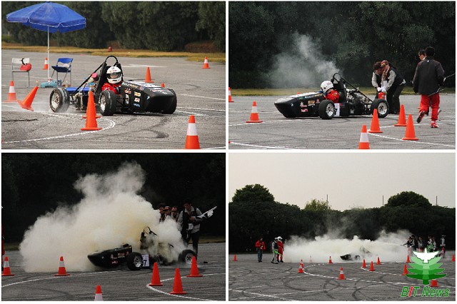 但是,比赛现场发生了出人意料情况。由于对比赛赛道路面状况不熟悉,在第一名车手的驾驶过程中,赛车发生了严重颠簸。在车手紧急制动后,排气管处的石灰棉由于高温开始冒烟,并引发明火,负责安保的车队成员和现场志愿者迅速用灭火器进行了灭火和降温。之后,赛车被组委会要求退回基地进行检修,次日视车况再决定是否可以继续参加比赛。许多其他高校的同学纷纷表示惋惜,也对北理工能否及时排除障碍继续比赛表示怀疑。