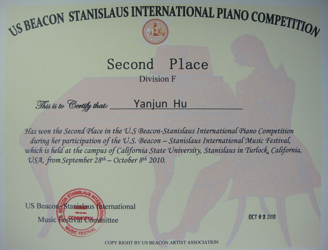 第二届美国贝肯-施坦尼劳斯国际钢琴比赛于2010年10月3日在美国加州旧金山落下帷幕。我校大学生艺术团钢琴团共派出三名学生胡验君、张坦和任镜蓉,由指导老师王倩带队在十一国庆假期赴美与各国的学生们同场竞技。本次比赛共设一等奖一名,二等奖两名,在200多名世界各地的参赛选手中,我校钢琴团的同学脱颖而出,2008级学生胡验君夺得二等奖,2009级学生张坦夺得优秀奖。