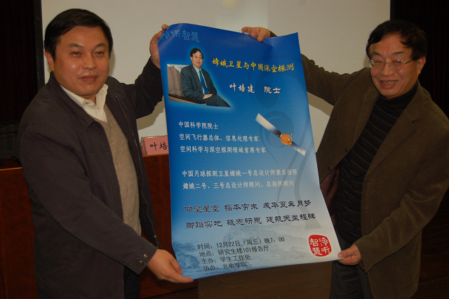 学生工作处常务副处长杨海主持讲座,并作简单介绍:叶培建院士现任中国月球探测卫星嫦娥二号、嫦娥三号总设计师顾问、总指挥顾问,曾任嫦娥一号总设计师兼总指挥,是我国空间飞行器总体、信息处理专家,空间科学与深空探测领域首席专家。