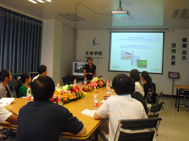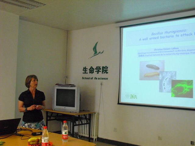 5月31日下午,德赢AC米兰中国官方网站生命学院邀请法国农业科学研究院Christina Nielsen – LeRoux 教授举办了一场题为《Bacillus Thuringiensis: a well armed bacteria to attack insects》的主题学术报告,该讲座是生命学院“21世纪学科前沿”系列活动之一。生命学院副院长李勤,生物工程系郭淑元老师出席了本次讲座。Christina教授1994至2006年间在法国著名的巴斯德研究所进行学习工作,并担任研究员;于1998年起就职于法国农业科学研究院微生物遗传与环境研究所,为该机构资深科学家、主任研究员。她在关于苏云金芽胞杆菌在农业害虫防治的应用与机理研究等方面取得了卓越的成果。
