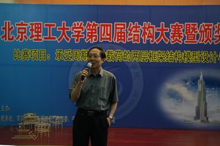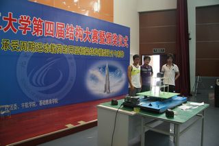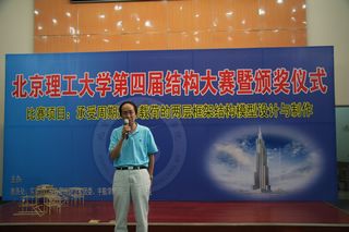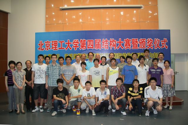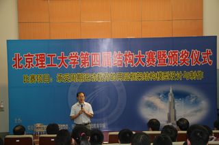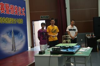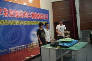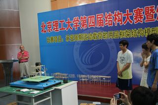 此次大赛的题目为承受周期运动载荷的两层框架结构模型设计与制作。比赛规定模型制作材料为桐木和白乳胶,不允许使用任何其它材料。进入决赛的20组选手带来了各自精心制作的框架模型,决赛要求作品载重两个重达3.8千克的质量块在加载频率为3赫兹、振幅为27mm的震动测试平台上坚持30秒。经过紧张激烈的比赛,最后有2组同学制作的框架模型成功通过了考验。