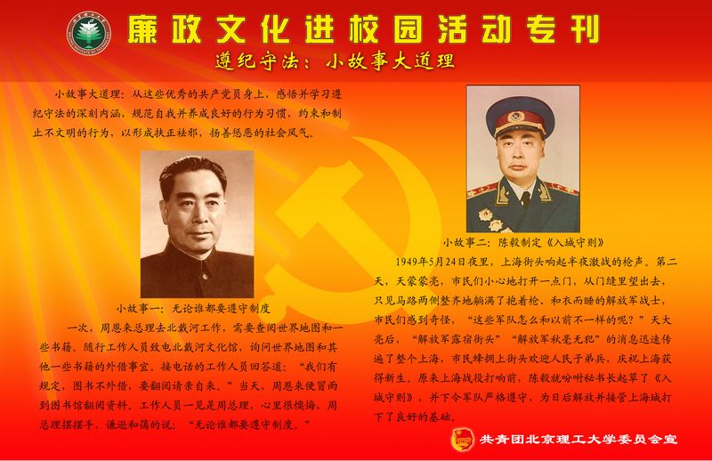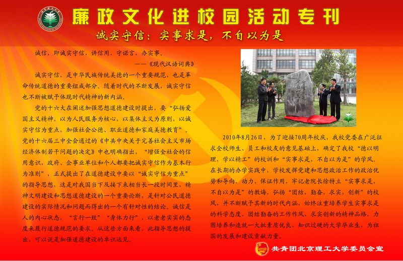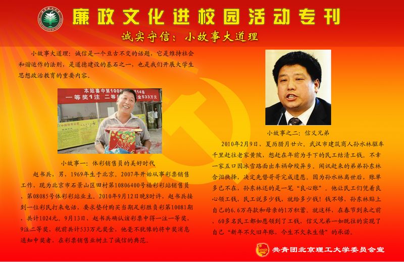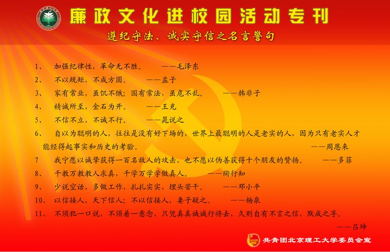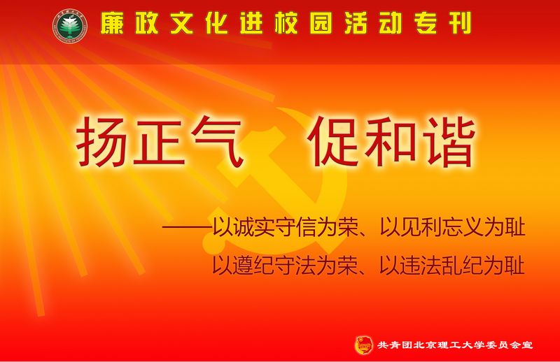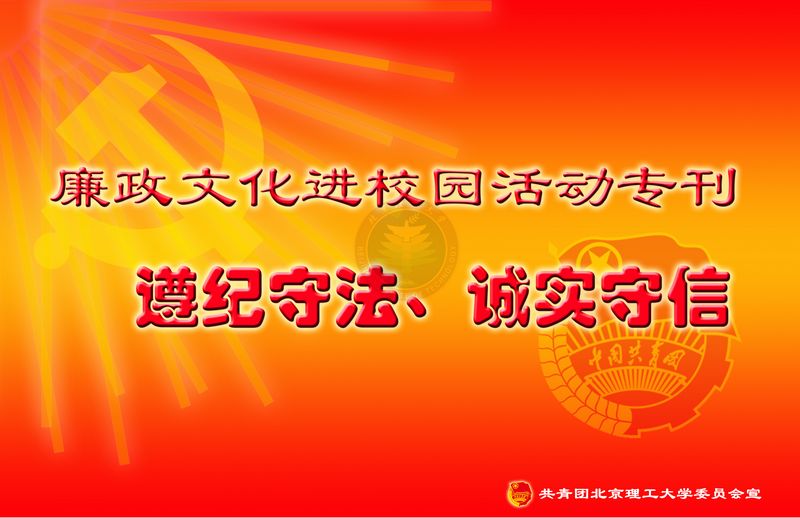 【编者按】按照学校《德赢AC米兰中国官方网站2011年党风廉政建设宣传教育月活动实施方案》的要求,校团委从近日起,将依托校园网络、橱窗等主要宣传阵地,面向全校青年学生开展“遵纪守法 诚实守信”为主题的宣传工作,旨在通过在全校范围内进行主题宣传教育,加大廉政文化进校园宣传力度,进一步提高学生的纪律观念、法制观念和诚信意识。