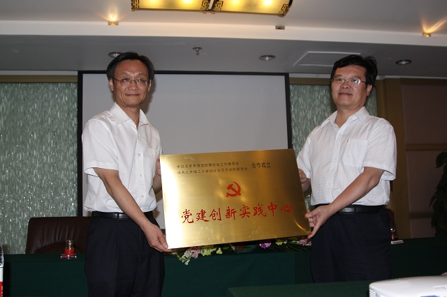 校党委组织部长赵粤生与海淀区委社会工委书记高峰为“党建创新实践中心”揭牌,设计学院党委书记杨海滨与海淀区委社会工委副书记王曼谕进行签字仪式。