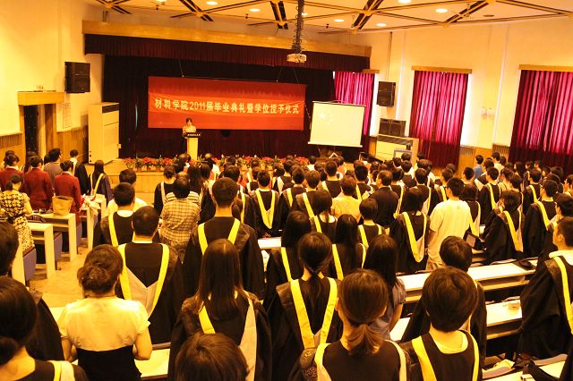 6月21日,材料学院2011届毕业典礼暨学位授予仪式在七号楼报告厅隆重举行,材料学院院领导、各系教师出席了典礼,同所有毕业生以及远道而来的家长们一起共同见证这个收获的激动的时刻。毕业典礼由07级本科毕业生李巍巍主持,由于学院博士毕业生中有一位留学生,所以还特邀了07级本科毕业生武金丹担任英语主持人。