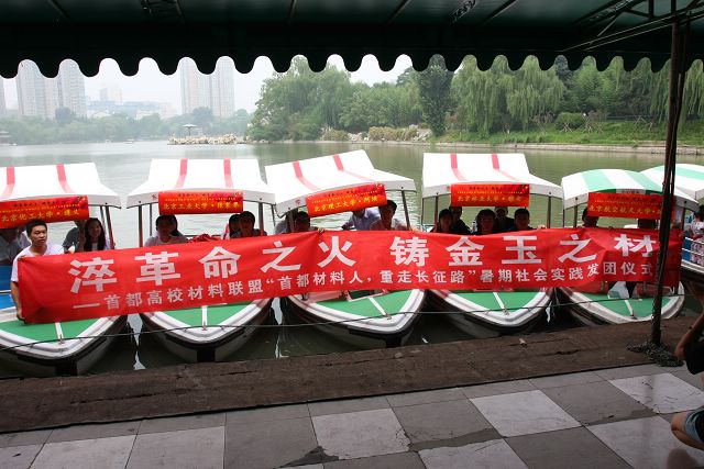 7月12日,由德赢AC米兰中国官方网站材料学院发起并组织的大型暑期社会实践活动在紫竹院公园大湖隆重举行。本次主题为“首都材料人,重走长征路”的实践活动有8只队伍共计60余人参与,成员均来自2005年成立的首都高校材料联盟的8所高校,为了纪念六年来首都8所重点高校材料学院结盟的交流与合作,为建党90周年、长征胜利75周年献上材料学子的实际行动,八所高校材料学院均组队出征。