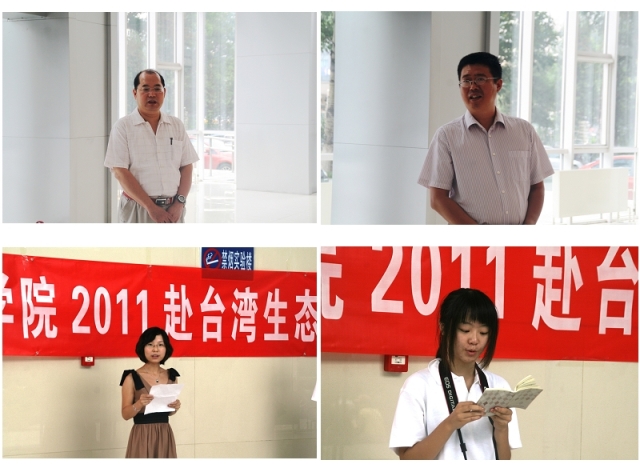 2011年赴台生态科考社会实践活动发团仪式,首先由生态科考指导老师雷笑,向与会领导和师生介绍了本次科考的行程安排。随后,队员代表生命学院2008级本科生刘京亚同学代表全体科考队员发言,她首先感谢学校、学院能给予这次宝贵的实践机会,并代表全体队员表达了遵守纪律,团结协作,服从安排,确保科考圆满成功的决心。