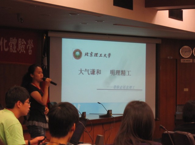 在开训仪式上,淡江大学国际事务副校长戴万钦博士代表致开营词,对内地各高校的到来表示诚挚欢迎,并着重介绍活动的意义,最后提出对本次活动的殷切希望。随后,来自内地的12所高校依次进行5—10分钟的学校文化展示。我校学生代表高雨芹同学与北京大学学生代表向在场师生共同介绍了北京的城市风貌和风土人情,高雨芹同学以“高远的理想、精深的学术、强健的体魄、恬美的心境”为主线,对我校的校园文化建设风貌、学术科技创新成果、学生社团活动等方面进行了介绍,其间穿插与全场师生的游戏互动,将北理工“德以明理 学以精工”的校训深刻留在了两岸师生的心中,受到淡江大学戴万钦副校长和在场高校师生的好评。