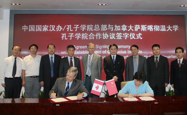 会议结束后,在国家汉办举行了协议签字仪式。萨斯喀彻温大学校长彼德•迈克金农教授和国家汉办许琳主任签署了“关于在萨斯喀彻温大学建立孔子学院的协议”。参加此次会议和签字仪式的还有加拿大萨斯喀彻温大学国际事务顾问汤姆•威夏(Tom Wishart)教授,萨斯喀彻温大学中国事务顾问宗力教授,我校副校长赵长禄教授,国际交流合作处处长王庆林教授,汪滢副处长以及我校人文学院副院长兼孔子学院院长喻佑斌。