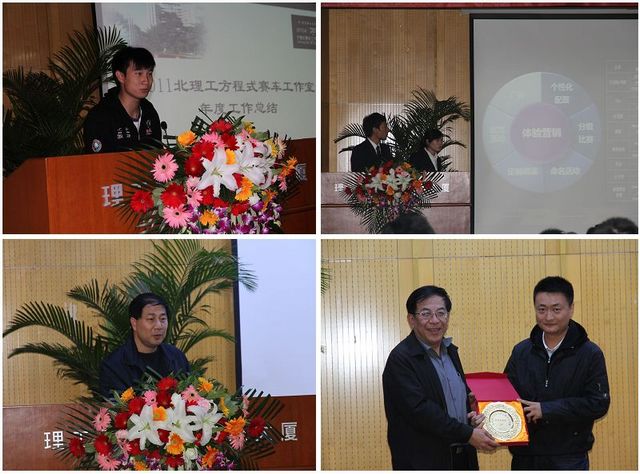 团队负责人董路宁代表方程式工作室做了年度工作总结(左上),分别就一年来的历程回顾、感想收获、工作室建设和未来规划做了具体阐述,使得在场观众能够全方面、深层次地了解北理工方程式工作室一年来的工作内容和具体收获,同时更加为这群追逐梦想的同学们感到骄傲。为了让在场来宾更深刻感受同学们在这一年中的收获,自动化学院本科生张子萌和管理学院研究生杨允现场重现了商业陈述比赛答辩(商业陈述比赛第一名),清晰的思路、简洁的表达、巧妙的构思和精美的PPT都给观众留下的深刻的印象,也看到了他们背后付出的努力(右上)。