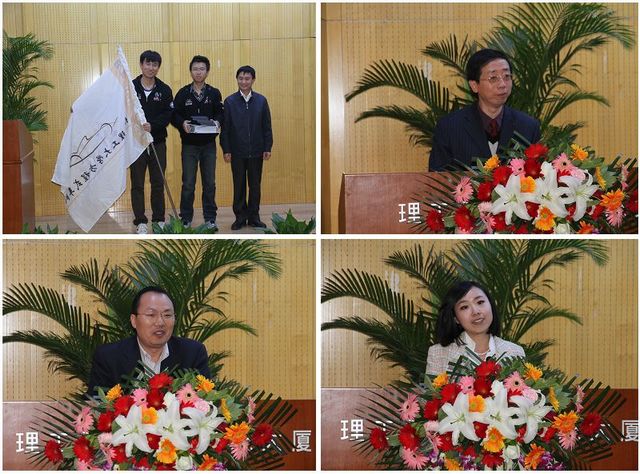 校长助理姚利民为新、老成员交接了旗帜和技术手册(左上),希望同学们能做好技术的传承,不断追逐新的进步,并同时做好文化的传承,打造一支具有鲜明特色、具有较宽辐射和具有较强实效的学生科技创新团队。蔡健先生(右上)、吴礼军先生(左下)和张洋洋女士(右下)代表企业讲话中指出,在北理工学生身上,看到了当今青年学生追求卓越的可贵精神、不怕困难的优良品质、团结协作的团队意识和勤于动手的实践能力,学生们为学校带来荣誉的同时,也为关心、支持这支团队的企业带来了荣誉,今后还将尽自己所能,大力支持高校人才培养工作。