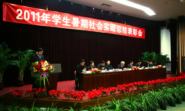 校党委副书记、副校长李和章在讲话中代表学校向获得表彰的先进集体、先进个人表示热烈祝贺,向在暑期社会实践活动组织工作中付出辛勤劳动的各组织单位及带队教师表示了感谢。李和章副书记在讲话中指出2011年学生暑期社会实践活动,立项团队百余只,参与学生千余名。在实践活动国际化,组团立项多元化,校友走访常态化,基地建设长效化等方面亮点突出,成果显著。社会实践活动已经成为同学们走出校门、奉献社会、了解国情的一个有效载体,已经成为同学们在大学生活阶段一次记忆深刻的学习机会和锻炼过程。李和章副书记还对今后的社会实践活动提出六点希望:一是要课内、外融合,提升社会实践的育人效果;二是要进一步提高社会观察实地调研的能力,在实地调研的基础上,力争产生更多的高水平成果,形成社科类的优秀调研报告;三是要注重社会实践基地的建设,打造一批大学生实践、实习、见习基地;四是要进一步推动社会实践活动的常态化,大力开展学期内社会实践活动,逐步探索开展寒假社会实践活动;五是要进一步加强社会实践活动的成果交流,激励更多的学生参与实践,提升实践质量和效果;六是要进一步加强社会实践活动的专业化、国际化,鼓励更多的团队走出国门开展实践,积极倡导学生跨高校组建团队开展实践活动。