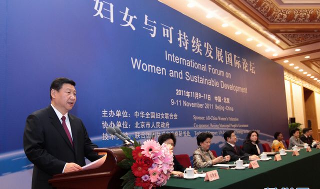 习近平指出,中国拥有世界上最大规模的妇女群体。为吸引广大妇女参与环境保护与可持续发展进程,公平分享改革发展成果,坚持实行男女平等基本国策,制定并不断完善维护妇女权益、促进妇女发展的法律法规,注重通过司法、行政、宣传、教育和经济、社会等多种手段保障妇女发展机会和权利。现在,越来越多的中国妇女自觉参与到环境保护与可持续发展中来。中国还将不断改善妇女发展环境,努力促进妇女事业与经济社会协调发展、妇女与男性平等发展和妇女自身全面发展。副主席习近平对本次论坛的举办表示热烈祝贺,对所有与会者表示诚挚欢迎。他强调指出,本次论坛将对进一步推动世界各国妇女能力建设、促进性别平等、促进妇女参与可持续发展各项决策产生积极而深远的影响 在开幕式上,全国妇联主席陈至立就妇女参与可持续发展发表了主题演讲。马其顿总统夫人伊万诺娃和联合国副秘书长沙祖康先后在开幕式上致辞。