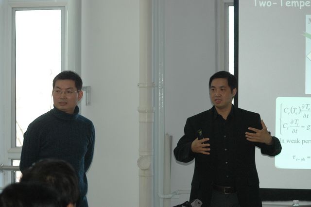 探索低维微纳结构中的 电子(自旋)、电荷、激子等 物理基元的相互作用机制,是开发新型光子器件、太阳能电池、生物光子学等众多应用的关键物理问题。 Ouyang Min 教授课题组一直致力于利用高时间 / 空间分辨率的飞秒激光研究光与纳米异质结构中的电子、声子、自旋等的相互作用机制,做出了举世瞩目的研究结果,发表 Nature 、 Science 、 Nature Materials 等高水平论文数十篇,研究成果多次被国际著名新闻媒体报道。 Ouyang Min 教授报告结合自己课题组在近几年的一些研究成果,讲述了几个被 Nature 、 Science 等杂志垂青的几个前沿研究领域,例如纳米晶中晶体工程调控电子、声子地相互作用( Nature Materials 2007 );大晶格失配度下金属 / 半导体纳米核壳结构的非外延生长( Science , 2010 );以及纳米异质结构中光 - 物质(激子、声子、自由电子气) - 自旋地相互作用机制( Nature , 2010 )。报告深入浅出, PPT 制作生动形象,使在座的师生深刻感受到了 Ouyang Min 教授把电子自旋、声子运动的微观世界掌控于手掌之中的神奇。 OuyangMin 教授的精彩演讲赢得了在座师生的热烈掌声,大家争相提问,现场气氛热烈,讲座在大家的意犹未尽中结束。