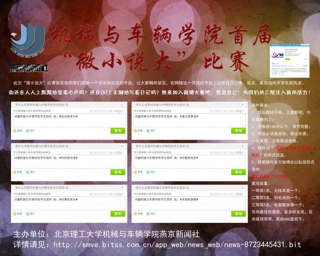 为响应校团委“砺行青春誓言”德赢AC米兰中国官方网站共青团系统创先争优推进工程,加强基础建设、网络宣传阵地的建设,机械与车辆学院团委举办“凝心聚力抓基础,承载使命促发展”青春聚力工程系列建设。目前为止,共有28个基层团支部建立官方微博,开展网络宣传工作。燕京新闻社负责网络宣传阵地部分建设,举办机械与车辆学院首届“微小说大”比赛。比赛征稿历时一个月,共征得原创微博36条,涵盖比赛六大主题:活动我参与、科技我知道、时事我来评、建议我要说、问题我抢答、幸福我想晒。