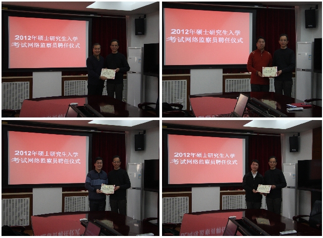 12月20日,2012年全国硕士学位研究生入学考试网络监察员的聘任仪式在二号楼会议室举行。孙逢春副校长,研究生院、纪委监察室、教务处、保密处、保卫处、网络中心、后勤集团等部门的主管领导参加了聘任仪式。