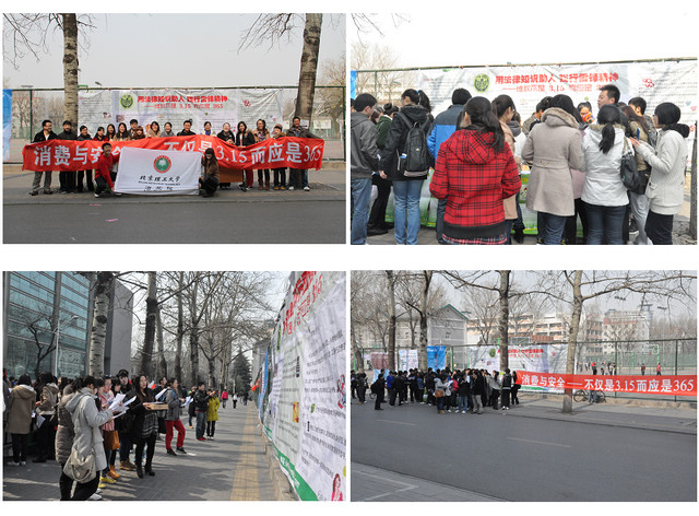 3月15日中午在新食堂对面响起了《青青法学院》的优美旋律,30多名法学院师生普法志愿者通过发放传单、组织有奖竞答、现场法律援助等多种形式开展普法宣传活动。在活动现场,一个印有32个消费常见法律问题的喷绘吸引了许多师生驻足观看,在这张宣传喷绘上,没有枯燥的法条,却用图文并茂的形式展现了一个个实用的法律知识。海淀区紫竹院工商所所长王浩及工作人员向大家讲解了工作当中遇到的消费侵权案件及其解决办法。同学们也纷纷提问,问题主要集中在网购、团购等方面,并对维权途径有了更广的认识。王浩所长表示,本次活动很有意义,了解了同学们的需求,注重与法学院的长期合作。同时,法学院法律援助中心的同学们在北理工居民区附近开展宣传,为社区居民解答消费疑难问题。